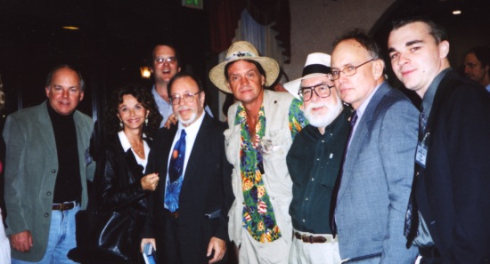 A happy bunch of speakers and staff on Saturday night. From the left: Robert Perala, Linda Moulton Howe, Brian Hall, Dr. Roger Lier, [need name], Jim Marrs, SB, John Greenewald (Photo by Debra Zotti)