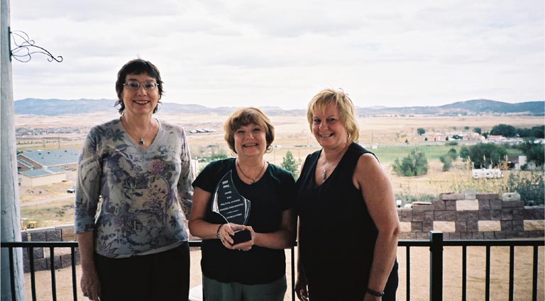 Betty Plummer and Peggy McConnell deliver the PRG Award for Courage in Politics to Frances Emma Barwood (Photo by Betty Plummer)