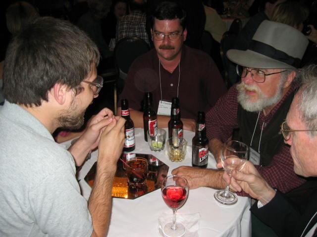 Clearly up to no good, Jim Marrs has gathered up a cabal of fellow conspirators. Judging by the number of drinks on the table, the plan may not be coherent, but that has never stopped Jim before. Photo courtesy of Jim Boka