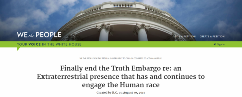 The Disclosure Activists have placed a new Disclosure petition on the White House website. It needs a few more signatures so it will be published to the public. Whatever the prospects are for a petition to achieve a response from the current administration, it's useful to raise the Disclosure flag for all who visit there to see.