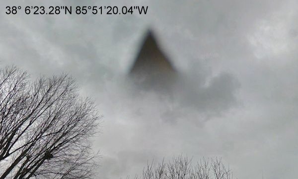 PRG calls to your attention the above image. That it is unusual is self-evident. What it represents is unknown. What is truly remarkable is this image comes from Google Earth. It can be found by scanning the sky from "street view" in Google Earth at the coordinates shown above. (See article.)