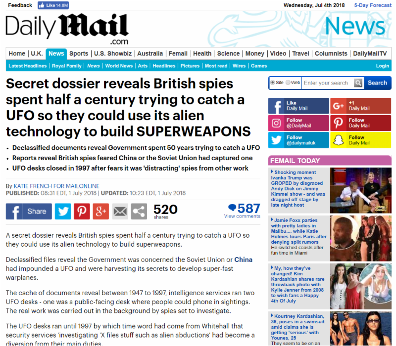 PRG tips its hat to the legendary Dr. David Clarke for a great get. This story has yet to hit the U.S., but it will. UFO's were of "no significance" but the UK was desperately trying to acquire one in order to get the technology. I guess the U.S. was not in a giving frame of mind regarding its retrieved ET tech. Even the mighty The Times deemed the story worthy of its attention. Are you starting to see a pattern yet?